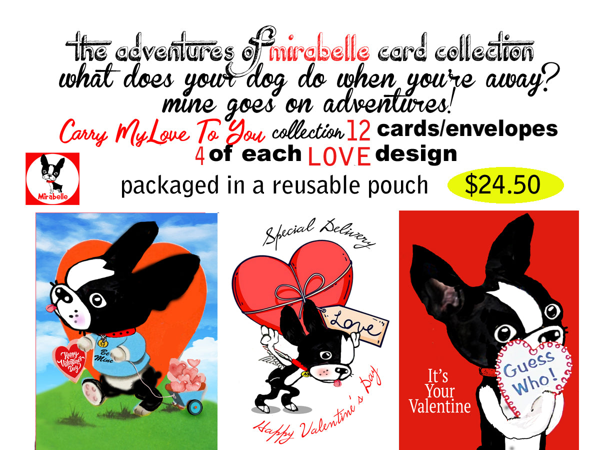 These 4.25" x 6" glossy cards comes with a red envelope. The inside is blank. All our great Mirabelle Valentine's designs are available as a single card, a box of 10 cards with our custom box option, or as print on our merchandise page. Three great ways to enjoy Mirabelle everyday! Thank you for your continued support of this one small dog with a lot of big adventures.