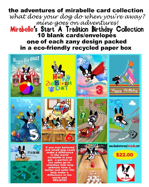 Start a great birthday tradition and give the gift of a Mirabelle card from 1 to 10! Each of these ten 4.25" x 6" cards are a photographic image mounted on a red glossy stock border. The boxed set comes with yellow envelopes and are blank inside, and comes in an eco-friendly, recycled red paper box. Thank you for your continued support of this one small dog with a lot of big adventures.