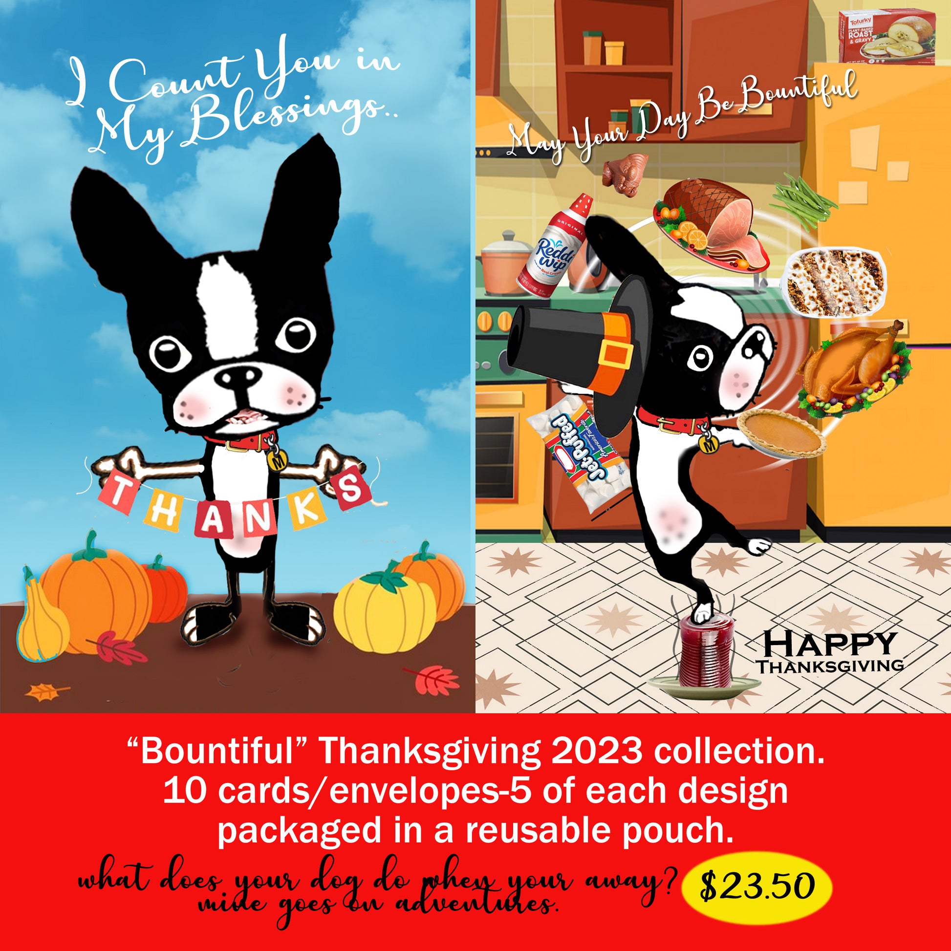 The 2023 Thanksgiving Greeting Card Collection. Five of each of the two new designs for 2023 from the Mirabelle "Bountiful" collection for a total of 10 amazing cards to send to your family and friends on this special holiday. Each card is 4.25" x 6" in size with a mounted photographic image on a red border. 10 cards and 10 matching yellow envelopes.